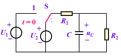1、在右图电路中,已知 U1 = 3 V, U2 = + 4 V,R1 = 3kΩ,R2 = 3kΩ,C = 3μF ,t < 0 时S接0端,电路已处于稳态。当t≥0 时,S接1端。则uC(0+)=( )。
