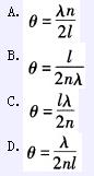 有一玻璃劈尖,置于空气中,劈尖角为θ,用波长为λ的单色光垂直照射时,测得相邻明纹间距为l,若玻璃的折射率为n,则θ,λ,l与n之间的关系为()。