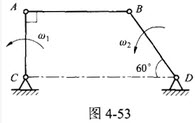 在图4-53所示四连杆机构中,杆CA的角速度ω1与杆DB的角速度ω2的关系为()。