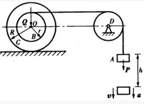 如图所示,物块A重为P,连在不计重量、不伸长的绳子上。绳子绕过定滑轮D并绕在鼓轮B上。当A下落时带动轮C沿水平直线轨道作纯滚动。鼓轮B的半径为r,C的半径为R,两轮固连,总重为Q,其对水平中心轴O的回转半径为ρ,轮D半径r,重不计,则物块A的加速度a为()。