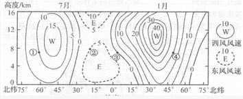 下图示意1月、7月北半球纬向风的平均风向及风速(单位:m/s)随纬度和高度的变化。读图回答下列各题。