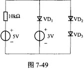 二极管电路如图7-49所示,三个二极管的正向压降均为0.7V,它们的工作状态是()。