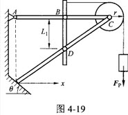 图4-19所示构架由AC、BD、CE三杆组成,A、B、D、C处为铰接,E处光滑接触。已知:Fp=2kN,θ=45°,杆及轮重均不计。则E处约束力的方向与x轴正向所成的夹角为()。