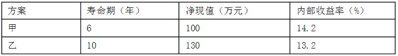 某项目有甲乙两个方案,基准收益率i=10%,两方案的净现值等有关指标见下表。已知(P/A,10%,6)=4.355,(P/A,10%,10)=6.145,则两方案可采用()