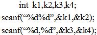 对于下述语句,若将10赋给变量k1和k3,将20赋给变量k2和k4,则应按()方式输入数据。