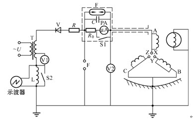 绘图题:图E-63为发电机定子绕组的直流耐压试验接线图,请写出虚线内F、C、PA、S1的名称。