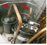 B:触感较热的铜管在压缩机顶部,较凉的在压缩机中下部