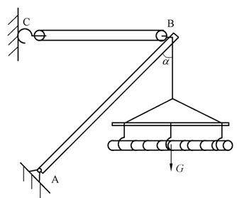 计算题:如图1所示为带电作业用抱杆起吊绝缘子串示意图。已知绝缘子串和吊瓶架的总重量G=2000N,抱杆与铅垂线交角α=45°。画出受力分析图并求滑车组BC受到的拉力和抱杆AB受到的压力分别是多少?(抱杆和滑车组重量忽略不计,A点为绞连。)