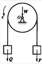 如图所示,均质圆盘重为W,半径为R,绳子绕过圆盘,两端各挂重为Q和P的物块,绳与盘之间无相对滑动,且不计绳重,则圆盘的角加速度为()。