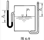 如图6-9所示,密闭容器,左测压管内为水银,右测压管内为水,测压管上部均为绝对真空,左侧测压管读数为20cm,则右侧测压管读数为()cm。