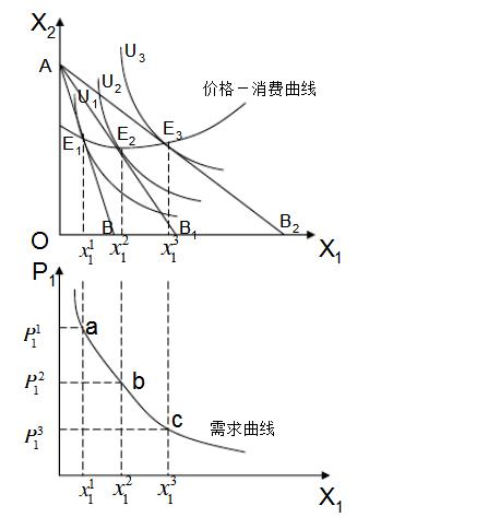 用图说明序数效用论者对消费者均衡条件的分析,以及在此基础上对需求曲线的推导。