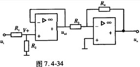 在图7.4-34示运算放大器应用电路中,电路参数已知,那么在输入信号的作用下,输出uo等于()。