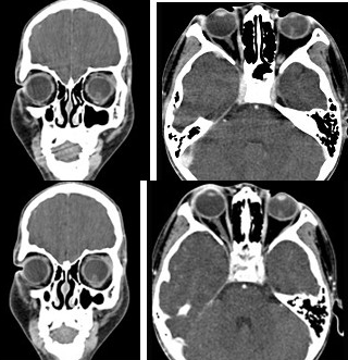 女性,46岁,自述左眼视物不清约三个月,CT扫描如图所示,请选择正确的描述或答案( )