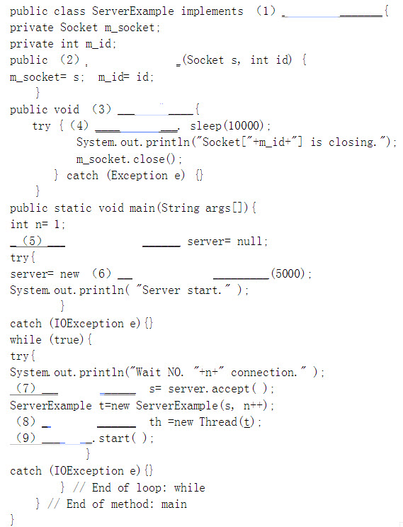 通过TCP协议方式,定义一个服务器端,端口为5000,要求可以同时连接多个客户端,并且每个客户端在休眠10秒钟之后退出连接;将下面的程序补齐: Import java.net.*; Import java.io.*;