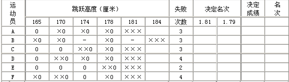 在下面跳高成绩记录表上填写成绩和名次及相关内容: