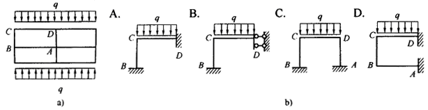 图a)为对称刚架,具有两根对称轴,利用对称性简化后,正确的计算简图为图b)四个图中的:()