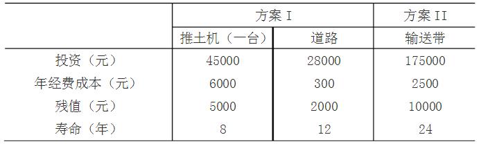某水泥厂计划新开一处岩坑,将材料经采石场运至加工厂有两个技术方案:方案I需购两部推土机,并在厂内修一条卸货用的道路;方案II建造一条由采石场至加工厂的输送带。有关资料如表