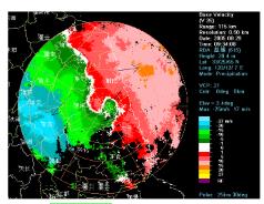 下图为一幅3.4°仰角的径向速度图,雷达上空低层风向为东南风,指出对流层中层急流的风速大小()(对于3.4°仰角,距离雷达75km处的高度约为5km)