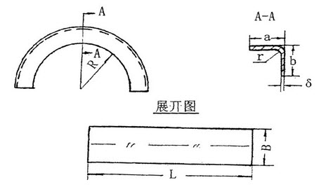 计算题:设a=10,b=10,r=2,R=15,δ=1,求图半圆形收边零件的展开尺寸。