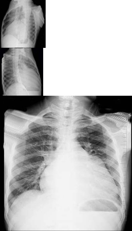 A:后前位示双侧肺血增多,肺动脉段隆起,左心缘出现第3弓