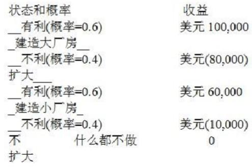 Larry Clement正在考虑增加一条新生产线,会涉及建造一新厂房。可以选择建造大厂房、建造小厂房或不增加新生产线。Clement已经确定了市场有利、需求高的概率为60%,市场不利、需求低的概率为40%。Clement已经编制了如下所示的决策树和在不同状态下的支出。