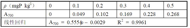 浸提剂100ml → 加一勺无磷活性炭 → 恒温(20~25℃)振荡30 min → 无磷滤纸过滤 (同时做空白试验) (2)溶液中磷的比色测定: →移取滤液10.0 ml 于150 ml三角瓶中→ 加水35ml → 加钼锑抗试剂5ml → 摇匀至无气泡 → 显色30 min → 700 nm比色,以空白液的吸收值为0,读出溶液的吸光度为0.138。 (3)制作标准曲线