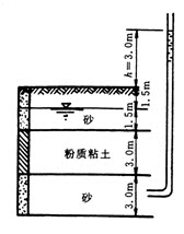 某粉质粘土层位于两砂层之间,如图所示。下层砂土受承压水作用,其水头高出地面3m。已知砂土的重度(水上)r=16.5kN/m3,饱和重度r