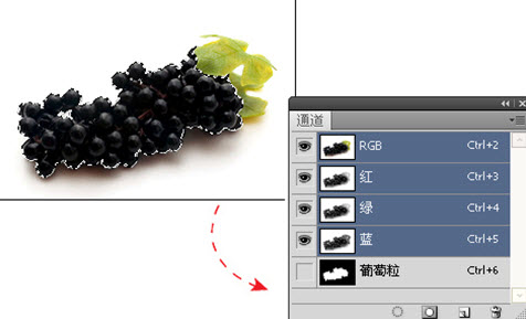 A:选择“葡萄粒”通道,单击通道面板中“将通道作为选区载入”按钮