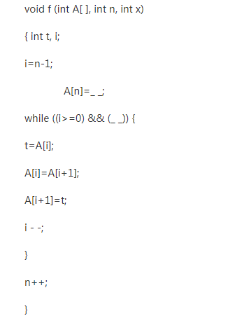 下列函数f(A,n,x)将正整数x插入已从小到大排序好的数组A中.数组A当前分量个数为n.例如,当A的前5个分量为(2,3,9,12,15),n=5时,调用f(A,n,10)后,n变为6,A的前6个量为:(2,3,9,10,12,15)。请填空。