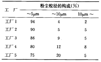五家耐火材料厂成型车间粉尘分散度测定结果如下表所示。