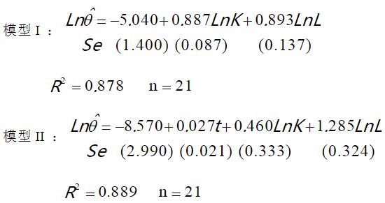 其中,θ=产量,K=资本,L=劳动时数,t=时间,n=样本容量,模型下括号内为参数估计的标准误。