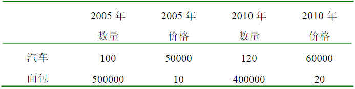 考虑一个生产并消费面包和汽车的简单经济。下表中是两个不同年份的数据。