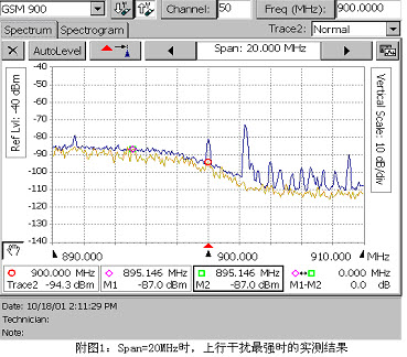 下图是一频谱测试仪的测试图,请指出上行噪声电平是多少?干扰信号的频率范围是多少?干扰信号信号源可能是什么?