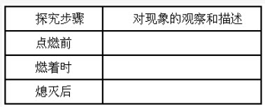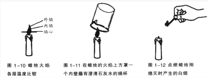 (1)点燃前观察蜡烛的颜色、状态、形状、硬度,闻一闻气味等。用小刀从蜡烛上切下一块石蜡,把它放入水中,观察它是否溶于水,是浮在水面还是沉入水底,并判断石蜡的密度与水的相比是小还是大。 (2)点燃蜡烛仔细观察燃着的蜡烛。蜡烛燃烧时发生了哪些变化?火焰分为几层?哪层最明亮?哪层最暗? 取一根火柴梗,拿住一端迅速平放入火焰中(如图1-10),约1s后取出,根据火柴梗在火焰不同部位被烧的情况,推测火焰哪一部分的温度最高,哪一部分的温度最低。 分别取一个干燥烧杯和一个用澄清石灰水润湿内壁的烧杯,先后罩在火焰上方(如图1-11),仔细观察烧杯壁上有什么现象发生。推测蜡烛燃烧后生成了什么物质。 (3)熄灭蜡烛观察蜡烛熄灭时有什么现象发生。用火柴去点蜡烛刚熄灭时产生的白烟(如图1-12),蜡烛能否重新燃烧?