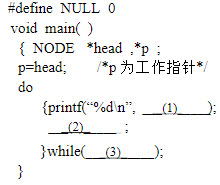 设线性表以不带头结点的单向链表存储,链表头指针为head,以下程序的功能是输出链表中各结点中的数据域data。完成程序中空格部分。