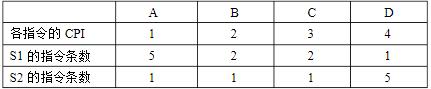 假定某编译器对某段高级语言程序编译生成两种不同的指令序列S1和S2,在时钟频率为500MHz的机器M上运行,目标指令序列中用到的指令类型有A、B、C和D四类。四类指令在M上的CPI和两个指令序列所用的各类指令条数如下表所示。