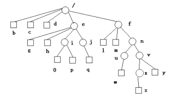据下图,圆圈代表目录,方框代表文件,当前目录为n,用相对路径法和绝对路径放分别写出文件g、o、z的路径。