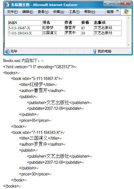 下面有关图书信息的XML文档“Books.xml”,请编写出相应的XSL文档,将其转换成Html格式,以表格的方式显示数据。转换的结果如图所示。