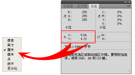 C:单击信息面板右上角的小三角按钮,在弹出菜单中选择面板选项,在弹出的信息选项对话框中设定鼠标坐标的标尺单位