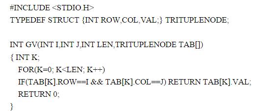 指出下面函数GV的功能及其返回值的含义。其中,Tab是存储稀疏矩阵A的非零元素的长度为LEN的三元组表。