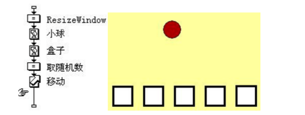 程序流程与演示窗口如图所示,要使小球随机落在下面的任意一个盒子中,{移动}设计图标应设置成哪种类型的动画效果()。