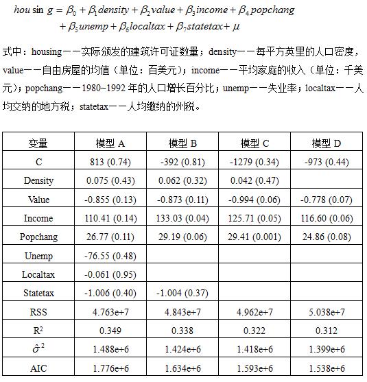 下表为有关经批准的私人住房单位及其决定因素的4个模型的估计和相关统计值(括号内为p值)(如果某项为空,则意味着模型中没有此变量)。数据为美国40个城市的数据。模型如下: