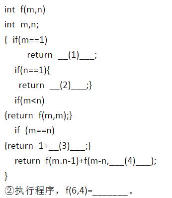 设m,n均为自然数,m可表示为一些不超过n的自然数之和,f(m,n)为这种表示方式的数目。例f(5,3)=5,有5种表示方式:3+2,3+1+1,2+2+1,2+1+1+1,1+1+1+1+1。 ①以下是该函数的程序段,请将未完成的部分填入,使之完整