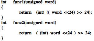 假设在一个32位机器上执行这些函数,该机器使用二进制补码表示带符号整数。无符号数采用逻辑移位,带符号整数采用算术移位。请填写表格,并说明函数func1和func2的功能。