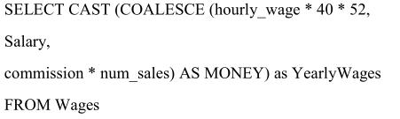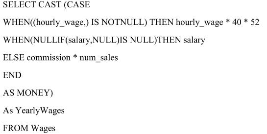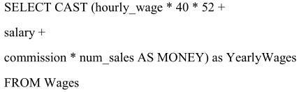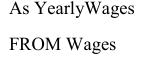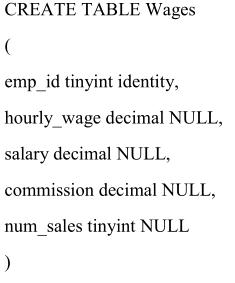 你是AdventureWorks的一个数据库开发者。你正为记录毎年工资信息的人类资源部门设计一个脚本。有三种类型的职员。一些职员挣每小时的工资,一些是薪水,还有一些按他们所做的销售来付给。这些数据被记录在Wages表中。用以下语句创建表: