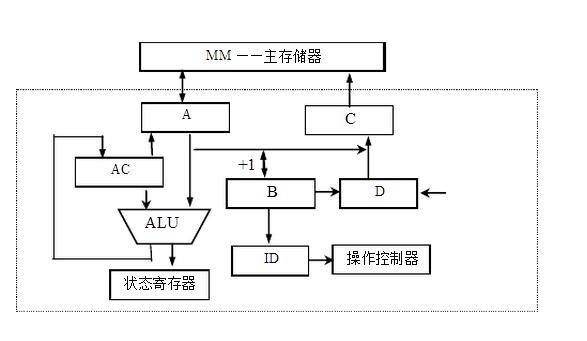 已知CPU结构如下图所示,其中包括一个累加器AC、一个状态寄存器和其他几个寄存器。各部分之间的连线表示数据通路,箭头表示信息传递方向。试完成以下工作:①写出图中四个寄存器A、B、C、D的名称和作用;②简述完成指令ADDY的数据通路(Y为存储单元地址,本指令功能为(AC)+(Y)→(AC)。