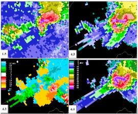下图所示为某个对流风暴1.5、4.3、6.0°仰角反射率因子和4.3°仰角径向速度图,该对流风暴向着雷达方向快速移动,雷达最大不模糊速度为27m/s,箭头位置距离雷达55km。此种雷达结构能确定何种天气?()