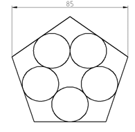 绘制如图所示图形,五边形内切5个相等圆,五边形左右两端点间距离为85,求五边形减去5个圆的面积。()