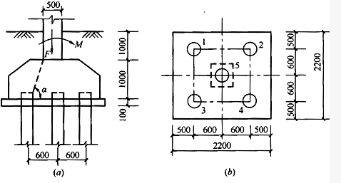 某建筑柱下桩基承台,布置5根沉管灌注桩,如图,桩直径d=500mm,承台高h=1000mm,有效高度h0=900mm,采用C25混凝土(ft=1.27N/mm2)。柱子截面尺寸为500mm×500mm,承台顶面处相应于作用的基本组合值为:轴压力F=2500kN,弯矩M=200kN·m。按《建筑地基基础设计规范》作答。