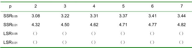 (2)根据方差分析表,请说明处理间由F检验得到的结论。 (3)多重比较(SSR法) ①计算小区平均数比较的